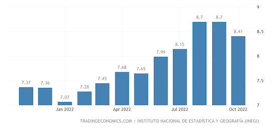 - Mexico’s inflation came in slightly below forecasts at 8.41% in the 12 months through October: